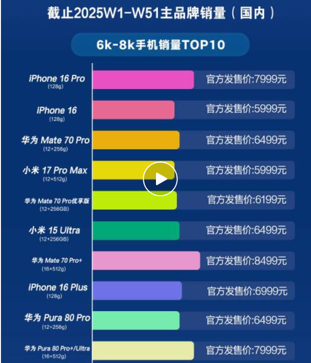 而近日,有博主发布了2025年W1-51,几乎完整的一年内,6000-8000手机销量排名前10的机型 情况。